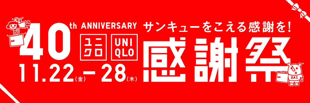 UNIQLO sẽ tổ chức đợt hạ giá kỷ niệm 40 năm thành lập “UNIQLO Thanksgiving”, từ ngày 22 đến ngày 28 tháng 11.
